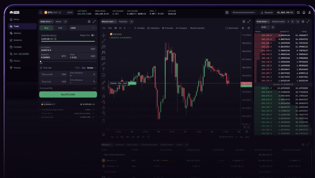 Kraken Pro offers advanced charting connected to TradingView, sophisticated order types, and a derivatives platform with up to 50x leverage on major pairs. Fees on Kraken Pro range from 0.00% to 0.26% depending on volume — highly competitive for a regulated Western exchange.