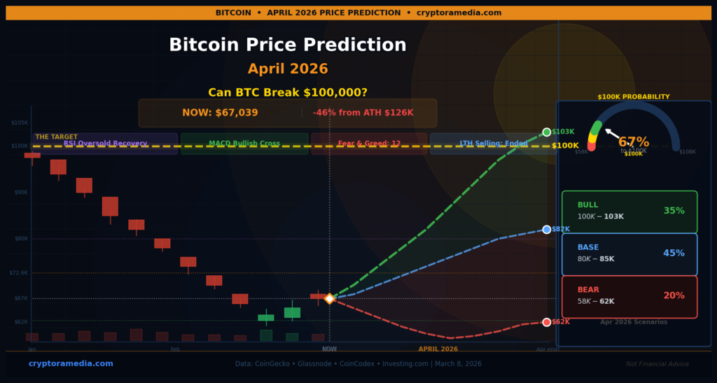 Nobody can predict the exact price with certainty. Based on current data, our base case puts Bitcoin between $78,000 and $95,000 in April 2026, assuming a gradual recovery from the current ~$65,000 level. The bull case reaches $95,000–$115,000, while the bear case keeps BTC between $55,000 and $72,000.