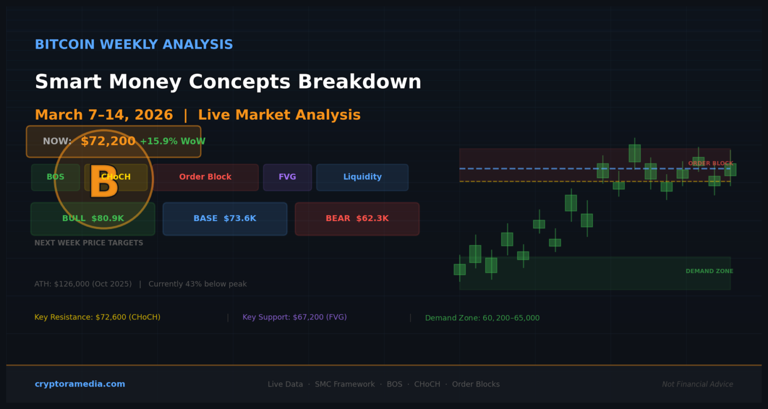 Live Market Update · Smart Money Concepts Breakdown · Next Week Price Forecast Bitcoin Live Snapshot — March 7, 2026 Price RIGHT NOW: $72,200 Weekly High: $74,500 Weekly Low:…